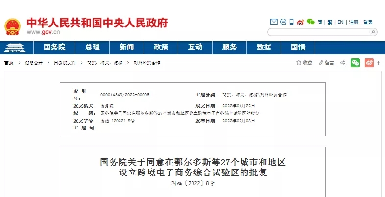 據(jù)中國(guó)政府網(wǎng)8日消息,國(guó)務(wù)院發(fā)布關(guān)于同意在鄂爾多斯等27個(gè)城市和地區(qū)設(shè)立跨境電子商務(wù)綜合試驗(yàn)區(qū)的批復(fù):同意在包括湖北省襄陽市在內(nèi)的等27個(gè)城市和地區(qū)設(shè)立跨境電子商務(wù)綜合試驗(yàn)區(qū)。