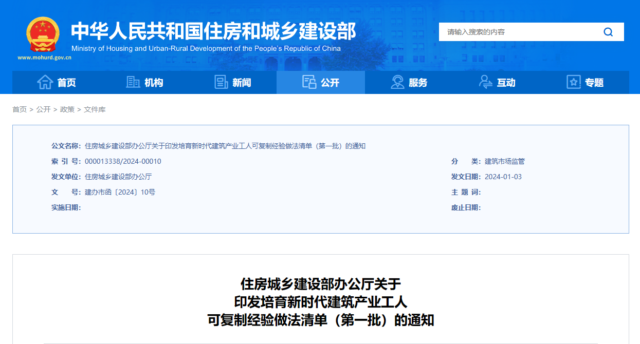 住房城鄉建設部辦公廳關于 印發培育新時代建筑產業工人 可復制經驗做法清單(第一批)的通知