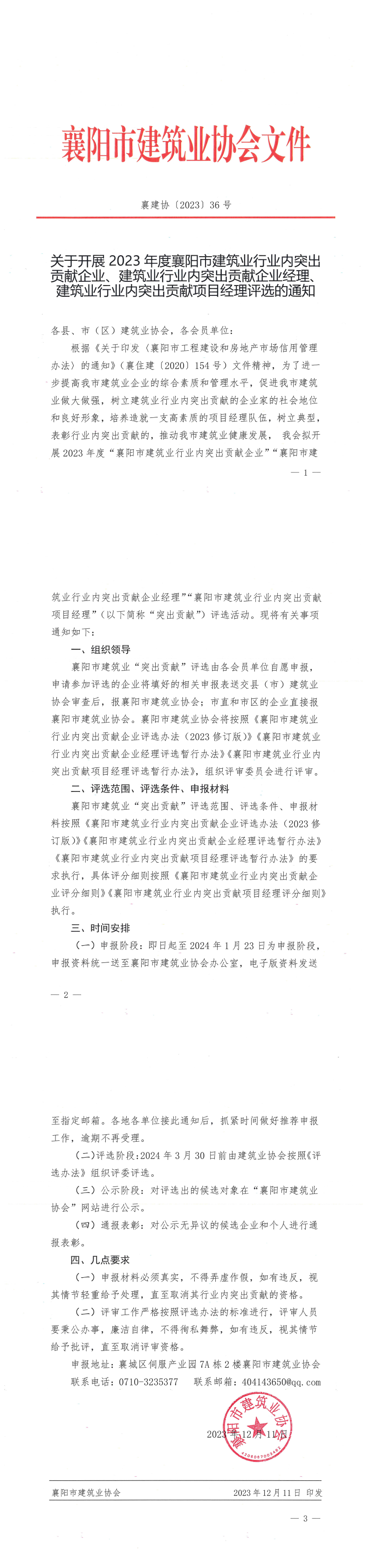 根據(jù)《關(guān)于印發(fā)〈襄陽市工程建設(shè)和房地產(chǎn)市場(chǎng)信用管理辦法〉的通知》(襄住建〔2020〕154號(hào))文件精神,為了進(jìn)一步提高我市建筑業(yè)企業(yè)的綜合素質(zhì)和管理水平,促進(jìn)我市建筑業(yè)做大做強(qiáng),樹立建筑業(yè)行業(yè)內(nèi)突出貢獻(xiàn)的企業(yè)家的社會(huì)地位和良好形象,培養(yǎng)造就一支高素質(zhì)的項(xiàng)目經(jīng)理隊(duì)伍,樹立典型,表彰行業(yè)內(nèi)突出貢獻(xiàn)的,推動(dòng)我市建筑業(yè)健康發(fā)展, 我會(huì)擬開展2023年度“襄陽市建筑業(yè)行業(yè)內(nèi)突出貢獻(xiàn)企業(yè)”“襄陽市建筑業(yè)行業(yè)內(nèi)突出貢獻(xiàn)企業(yè)經(jīng)理”“襄陽市建筑業(yè)行業(yè)內(nèi)突出貢獻(xiàn)項(xiàng)目經(jīng)理”(以下簡(jiǎn)稱“突出貢獻(xiàn)”)評(píng)選活動(dòng)。現(xiàn)將有關(guān)事項(xiàng)通知如下: