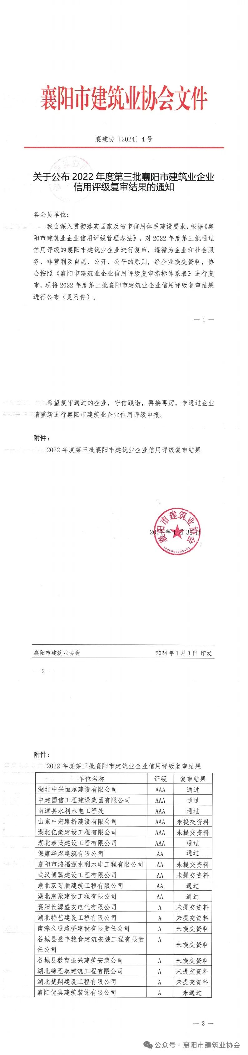 關于公布2022年度第三批襄陽市建筑業企業信用評級復審結果的通知
