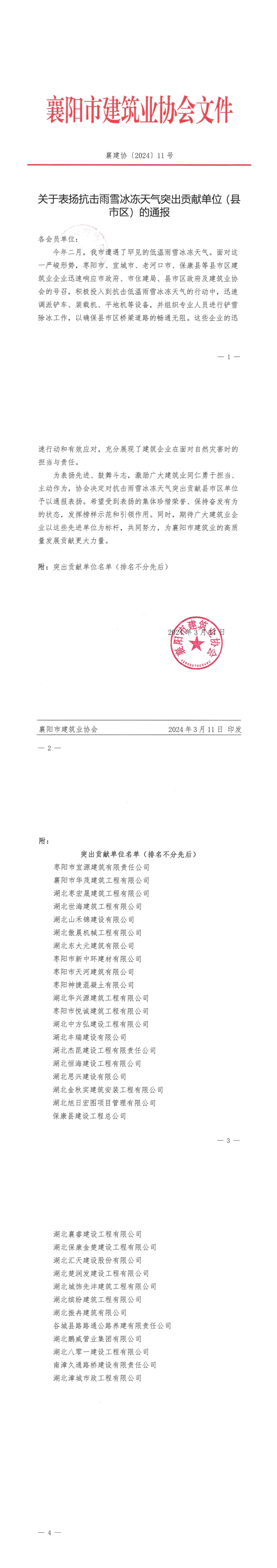 襄建協〔2024〕11號關于表揚抗擊雨雪冰凍天氣突出貢獻單位(縣市區)的通報(1)