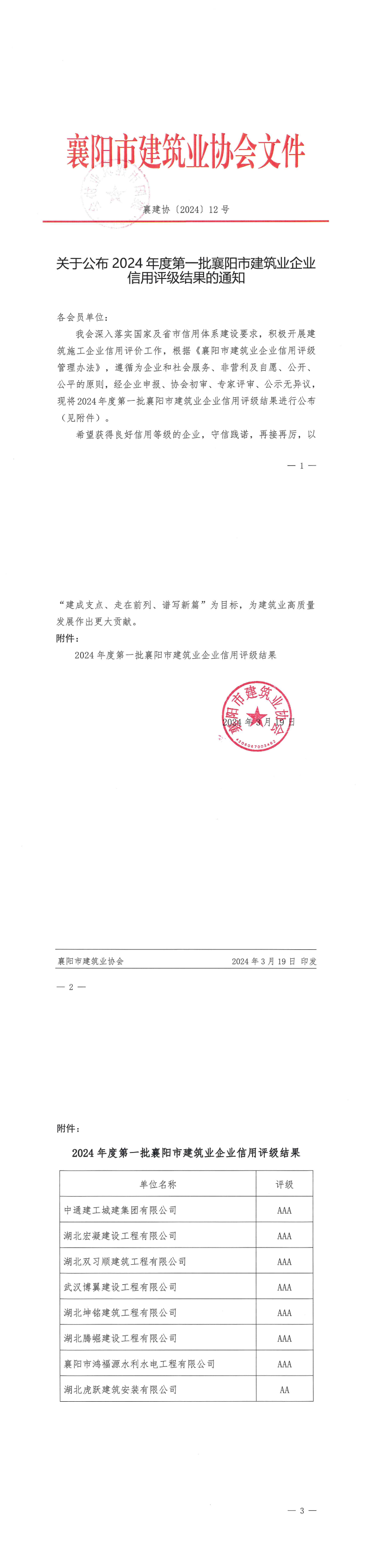 襄建協(xié)〔2024〕12號關于公布2024年度第一批襄陽市建筑業(yè)企業(yè)信用評級結果的通知