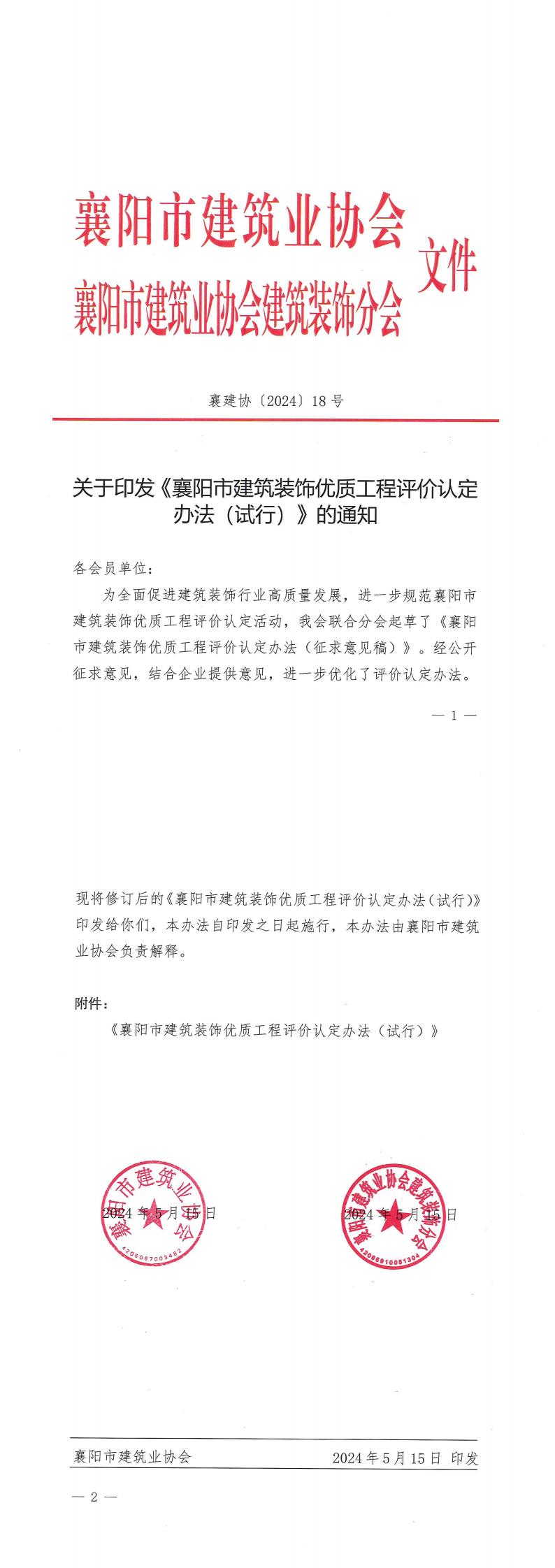 關于印發《襄陽市建筑裝飾優質工程評價認定辦法(試行)》的通知