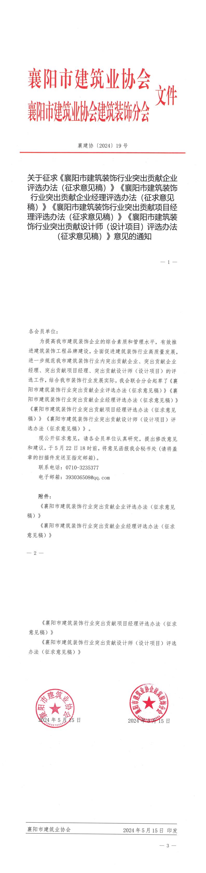 關于征求《襄陽市建筑裝飾行業突出貢獻企業評選辦法(征求意見稿)》《襄陽市建筑裝飾行業突出貢獻企業經理評選辦法(征求意見稿)》《襄陽市建筑裝飾行業突出貢獻項目經理評選辦法(征求意見稿)》《襄陽市建筑裝飾行業突出貢獻設計師(設計項目)評選辦法(征求意見稿)》意見的通知
