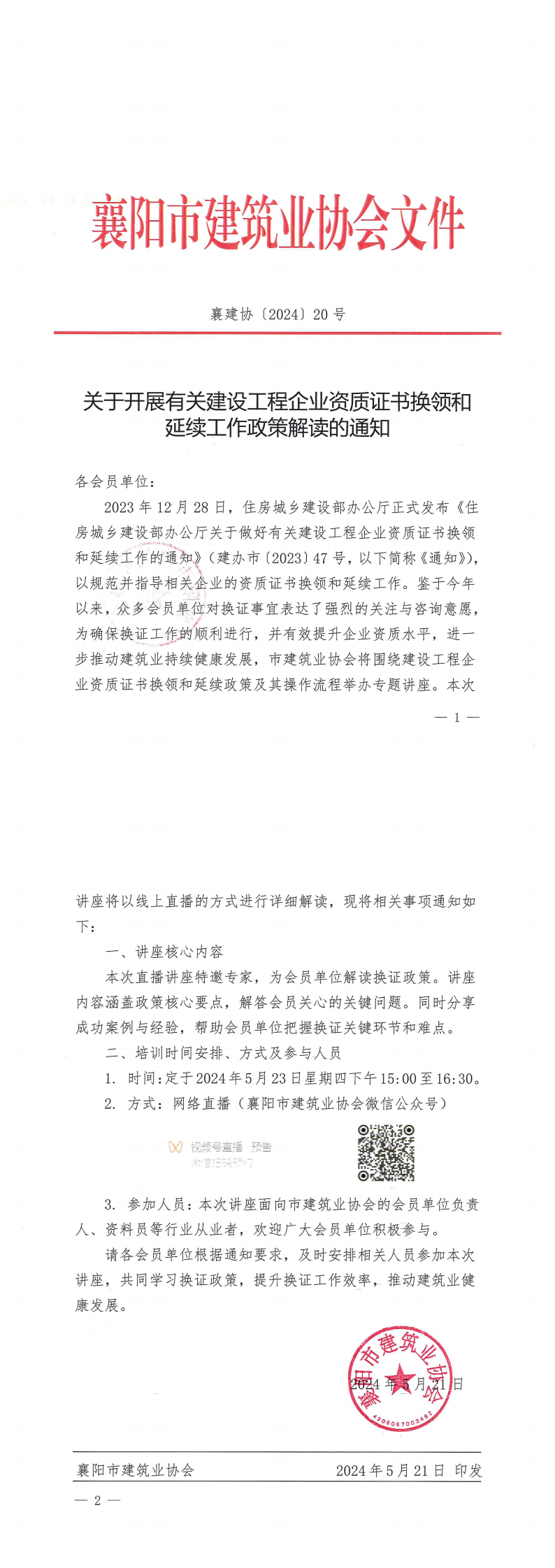 2023年12月28日,住房城鄉建設部辦公廳正式發布《住房城鄉建設部辦公廳關于做好有關建設工程企業資質證書換領和延續工作的通知》(建辦市〔2023〕47號,以下簡稱《通知》),以規范并指導相關企業的資質證書換領和延續工作。鑒于今年以來,眾多會員單位對換證事宜表達了強烈的關注與咨詢意愿,為確保換證工作的順利進行,并有效提升企業資質水平,進一步推動建筑業持續健康發展,市建筑業協會將圍繞建設工程企業資質證書換領和延續政策及其操作流程舉辦專題講座。本次講座將以線上直播的方式進行詳細解讀,現將相關事項通知如下: