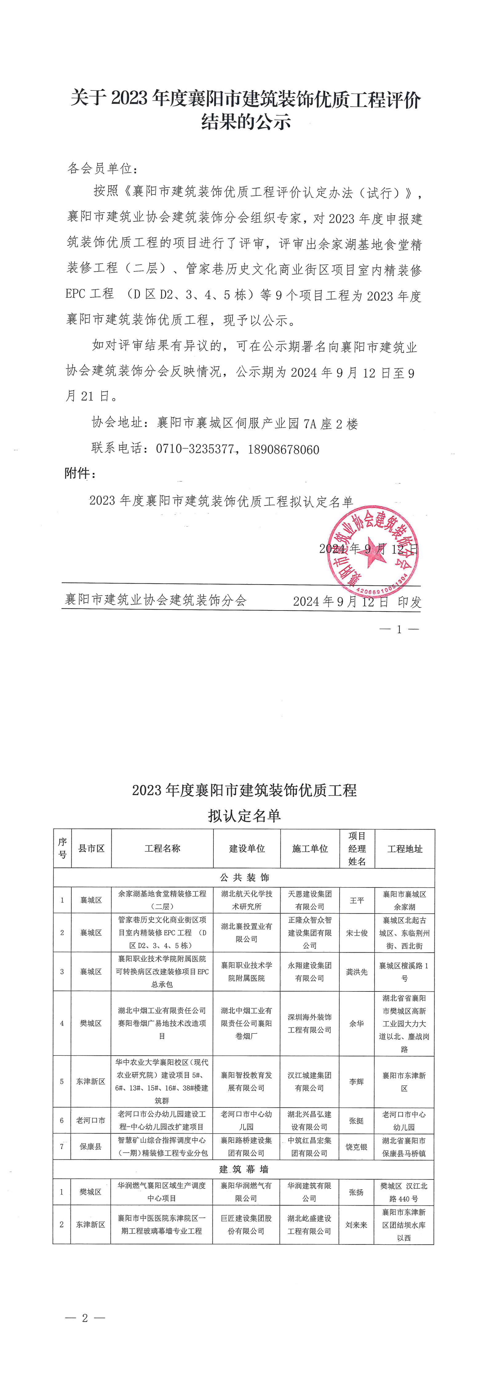 關(guān)于2023年度襄陽市建筑裝飾優(yōu)質(zhì)工程評價結(jié)果的公示