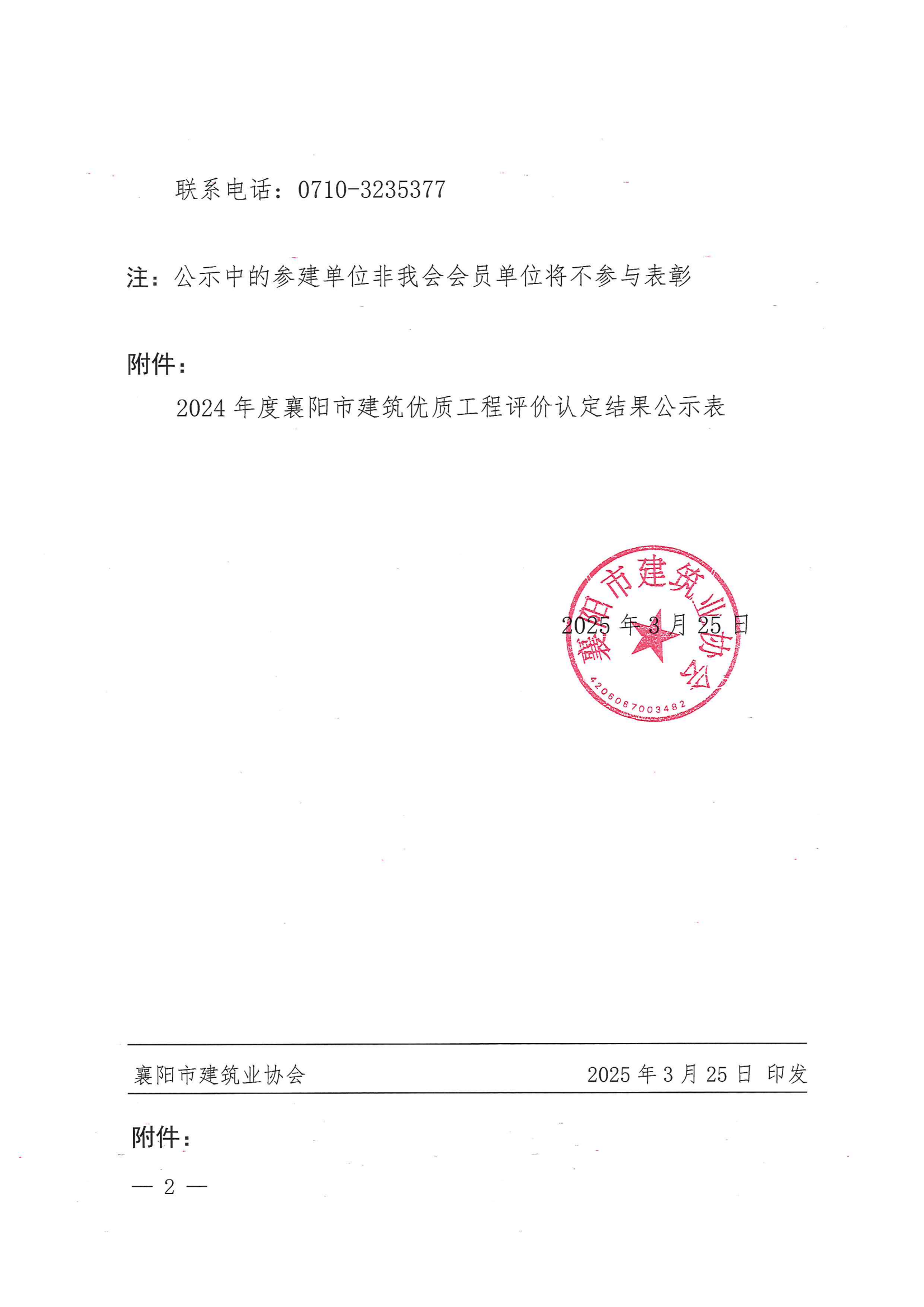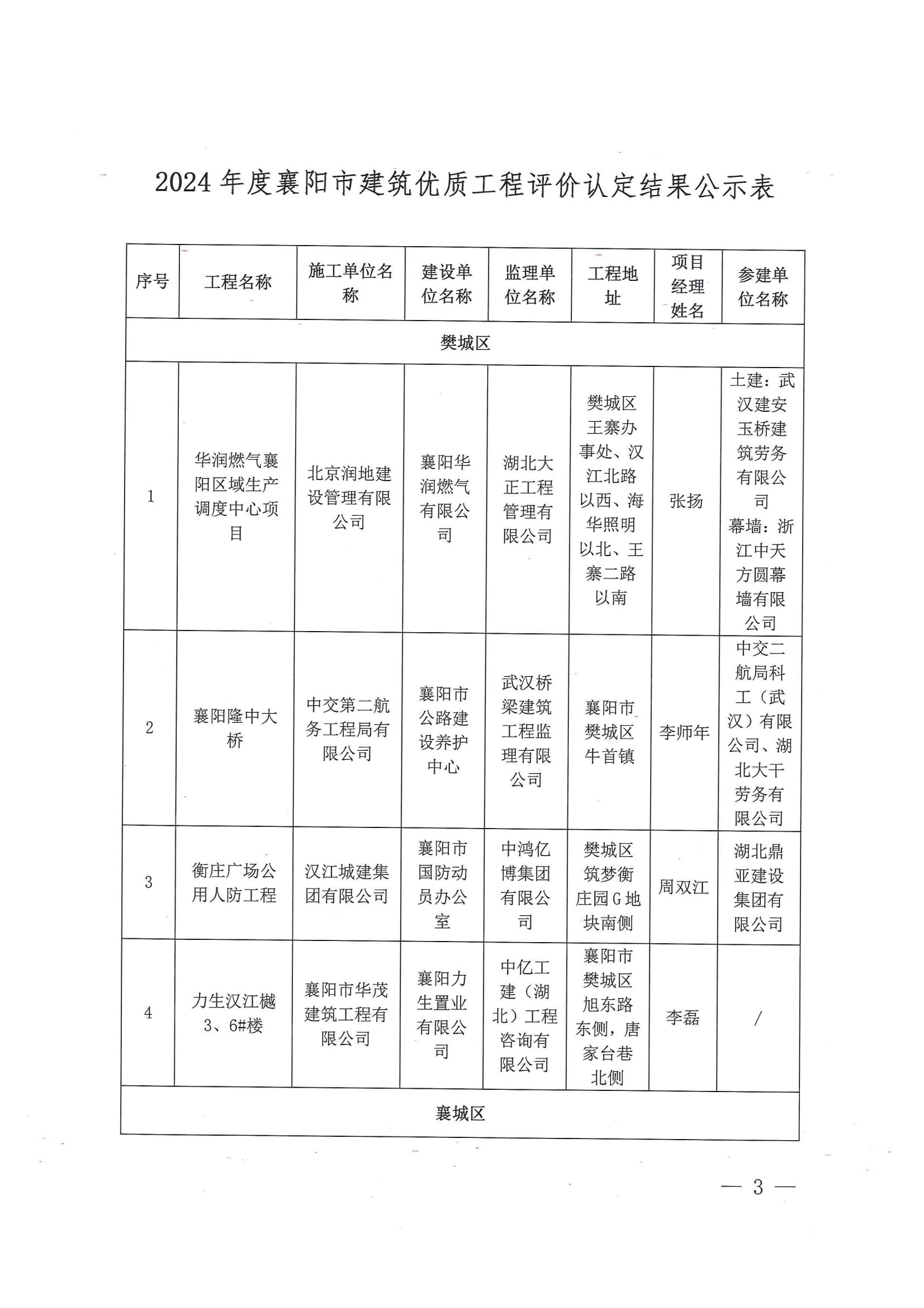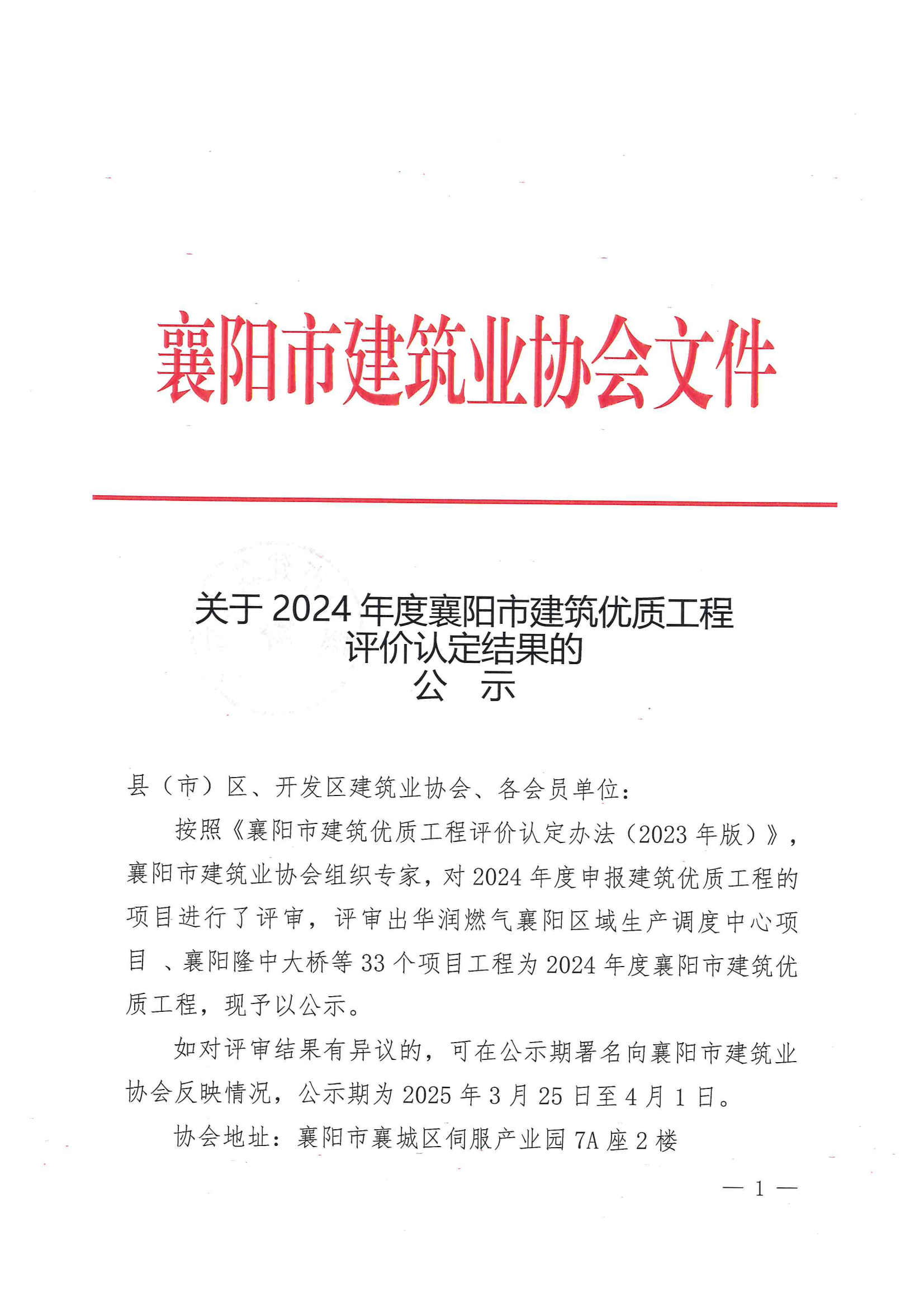 關(guān)于 2024 年度襄陽市建筑優(yōu)質(zhì)工程評價認定結(jié)果的公示