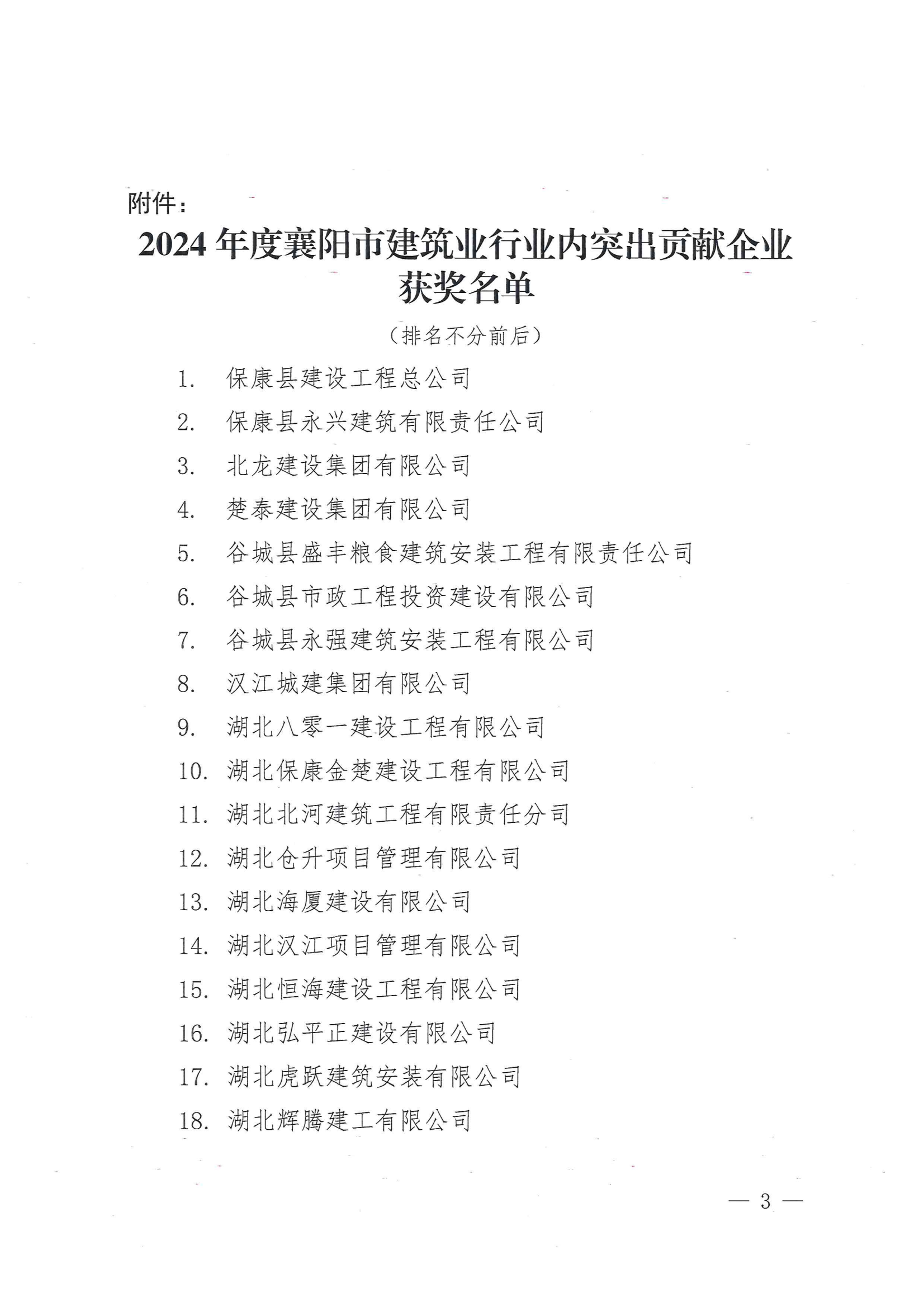 關(guān)于2024年度襄陽市建筑業(yè)行業(yè)內(nèi)突出貢獻企業(yè)、建筑業(yè)行業(yè)內(nèi)突出貢獻企業(yè)經(jīng)理、建筑業(yè)行業(yè)內(nèi)突出貢獻項目經(jīng)理評選結(jié)果的公示
