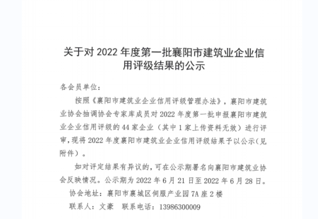 附件:關于對2022年度第一批襄陽市建筑業(yè)企業(yè)信用評級結(jié)果的公示.pdf 【查看全文】
