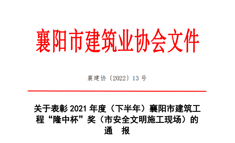 關于表彰2021年度(下半年)襄陽市建筑工程“隆中杯”獎(市安全文明施工現場)的通報.pdf 【查看全文】