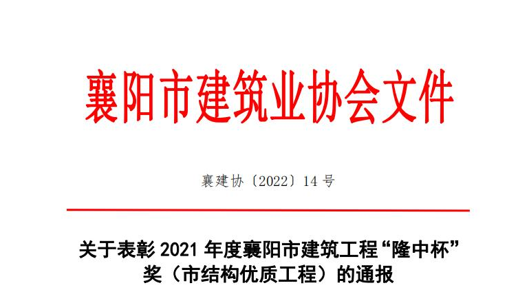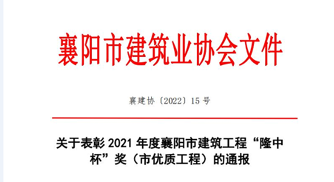 關于表彰2021年度襄陽市建筑工程“隆中杯”獎(市優質工程)的通報.pdf 【查看全文】