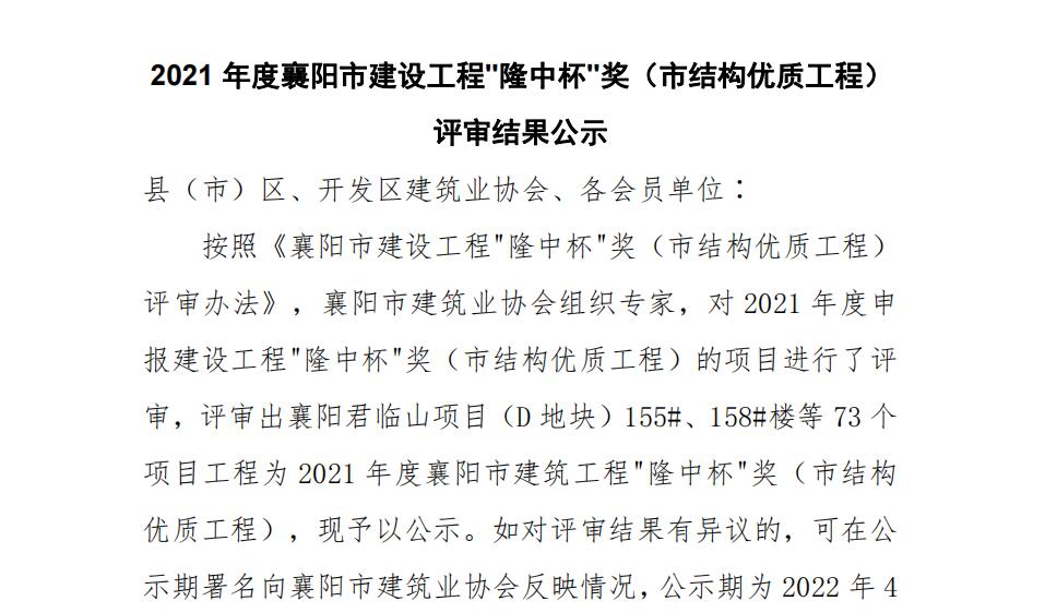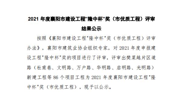 2021年度襄陽市建設(shè)工程“隆中杯”獎(市結(jié)構(gòu)優(yōu)質(zhì)工程)評審結(jié)果公示.pdf 【查看全文】