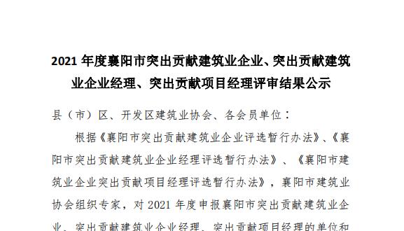 2021年度襄陽市突出貢獻建筑業(yè)企業(yè)、突出貢獻建筑業(yè)企業(yè)經(jīng)理、突出貢獻項目經(jīng)理評審結(jié)果公示.pdf 【查看全文】