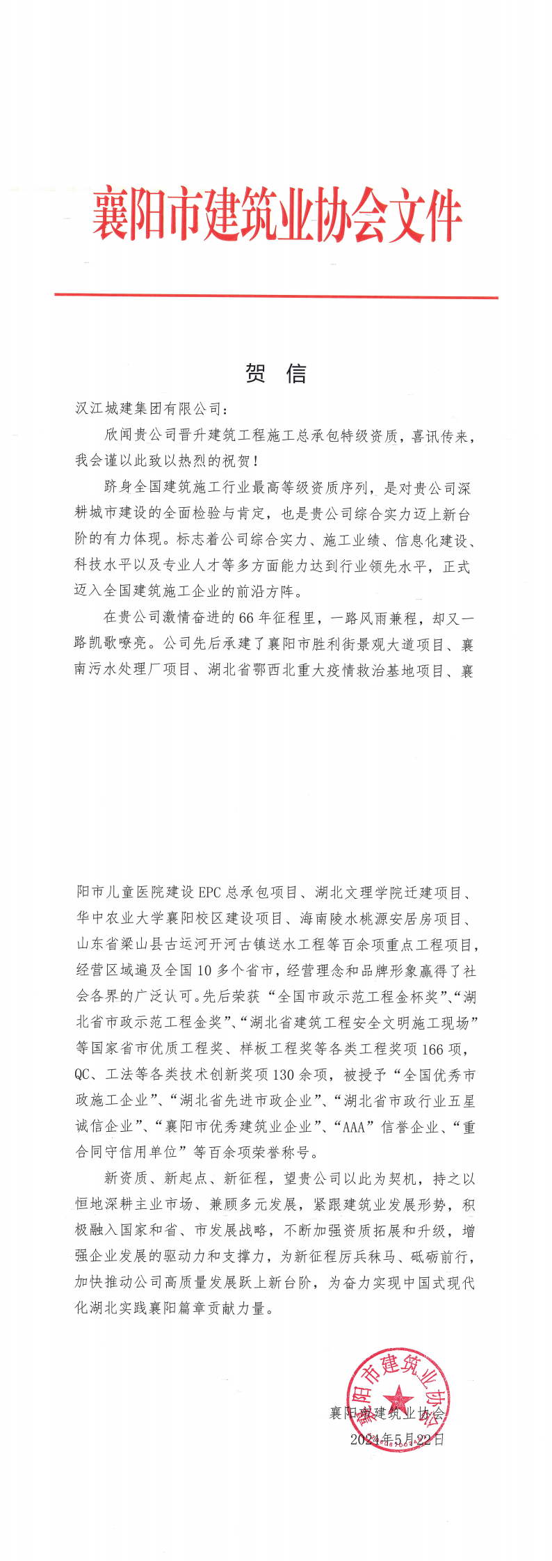 新資質、新起點、新征程,望貴公司以此為契機,持之以恒地深耕主業市場、兼顧多元發展,緊跟建筑業發展形勢,積極融入國家和省、市發展戰略,不斷加強資質拓展和升級,增強企業發展的驅動力和支撐力,為新征程厲兵秣馬、砥礪前行,加快推動公司高質量發展躍上新臺階,為奮力實現中國式現代化湖北實踐襄陽篇章貢獻力量。